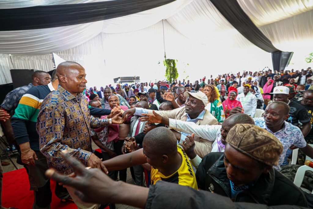 Deputy President Kithure Kindiki engages with boda boda representatives and other youths in Irunduni, Tharaka Nithi County.